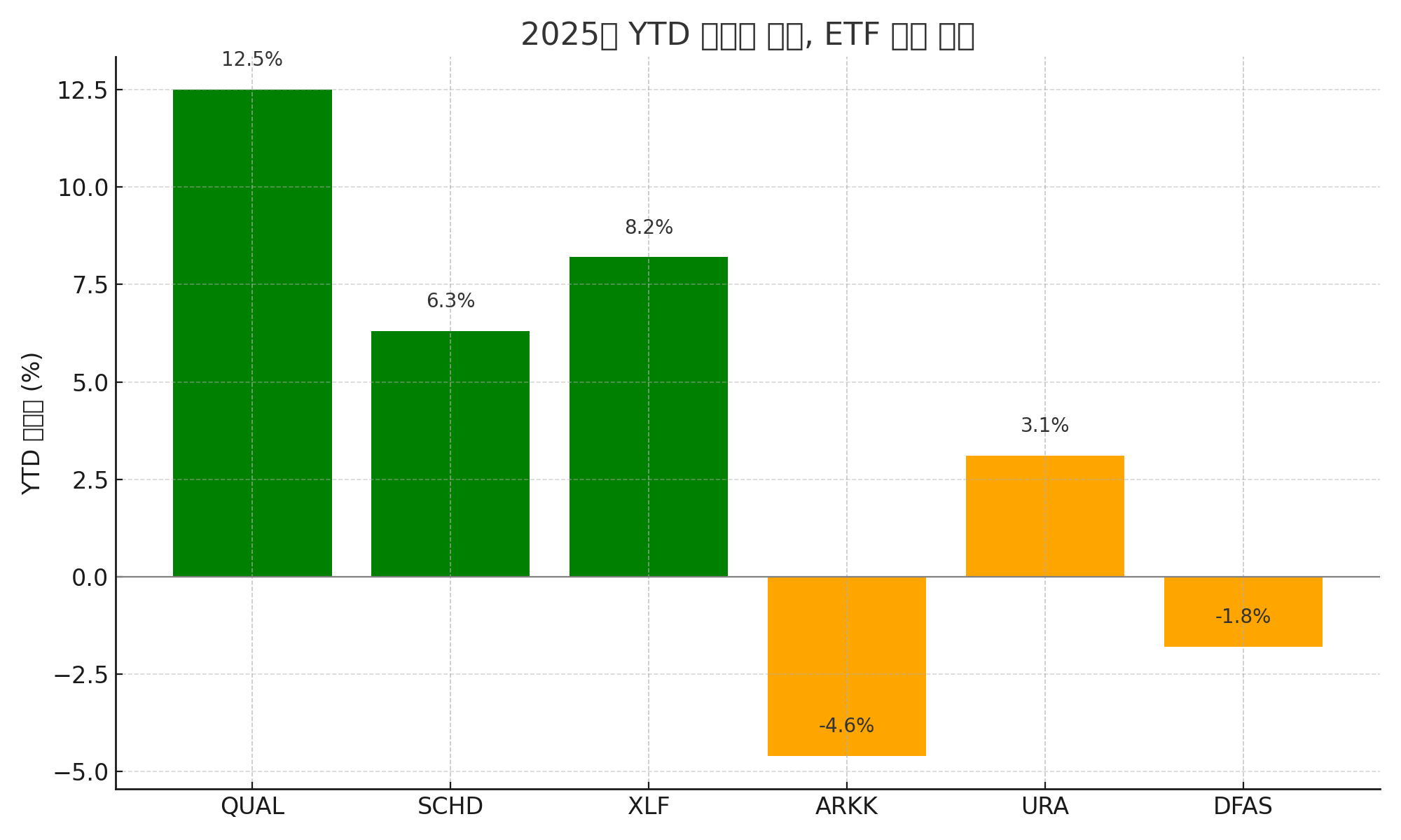 - SCHD: 배당 안정 + 성장성 보완, +6.3%