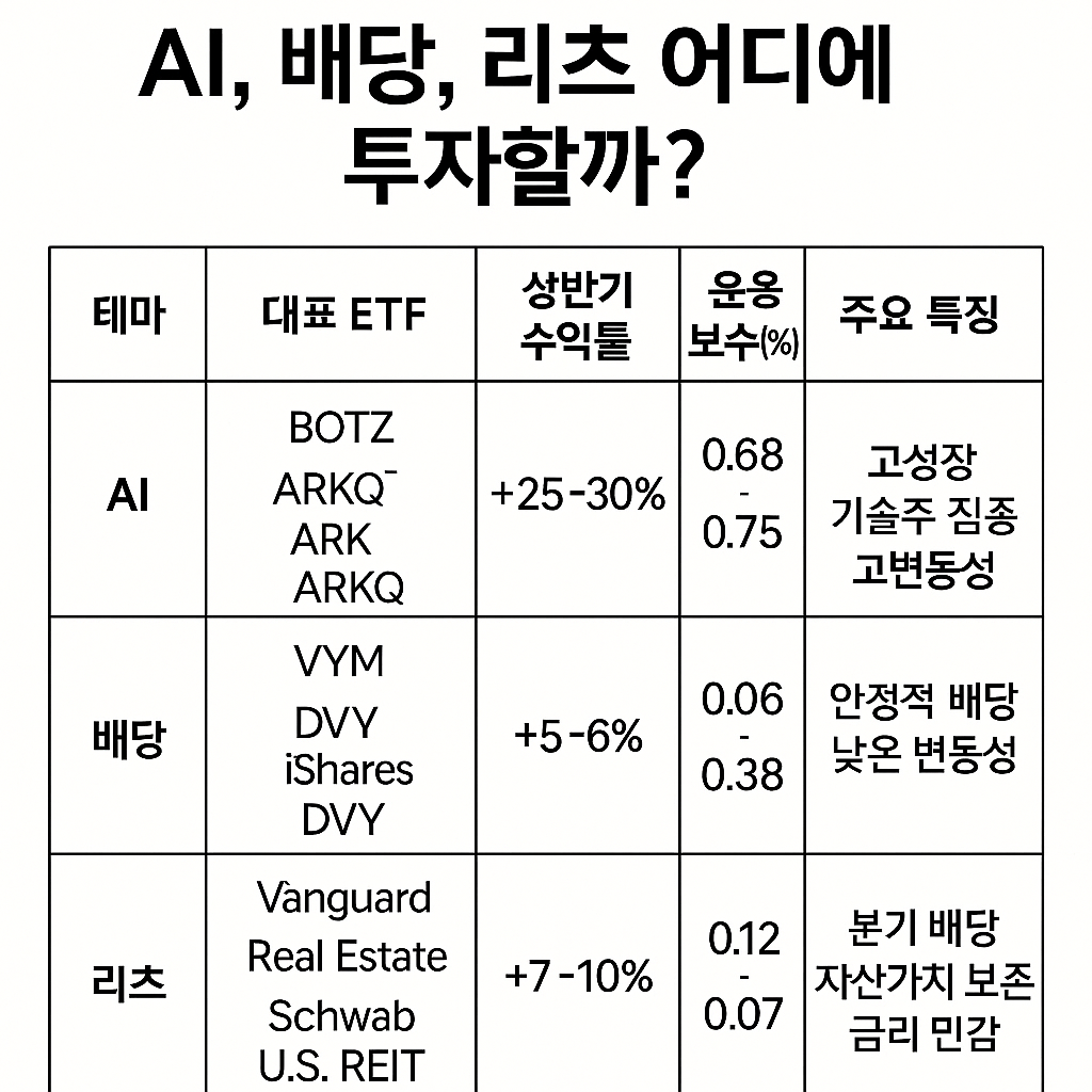 이 글에서는 AI, 배당, 리츠 ETF의 실제 데이터를 기반으로 각각의 특징과 투자 시 고려할 핵심 포인트를 정리합니다.